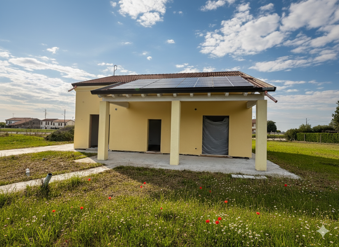 VILLA SINGOLA insistente su un lotto di circa 1800Mq, progettata e costruita con le più avanzate tecnologie edilizie e consegnata FINITA, CHIAVI IN MANO, completa di allacciamenti. Sviluppata principalmente al pian terreno, si compone di ampia zona giorno impreziosita da vetrate che garantiscono una incredibile luminosità, due camere matrimoniali, bagno, lavanderia con locale tecnico e splendido porticato. Attraverso una scala autoportante, si accede ad un soppalco a vista, nel quale è possibile ricavare una ulteriore camera da letto, un bagno già predisposto nei suoi impianti e uno studio.